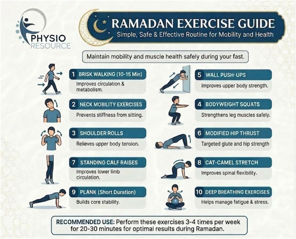 Yes, people can safely perform light to moderate exercise during Ramadan when they choose appropriate times for their workouts. Most physiotherapists recommend 30–45 minutes before Iftar or 1–2 hours after Iftar, when hydration and energy levels are more stable.