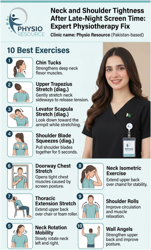 Many patients with neck and shoulder tightness after late-night screen time visit Physio Resource, the physiotherapy clinic in Gulberg, Lahore. Our top physiotherapist identifies the root cause. Provides targeted treatment. This helps restore your posture, mobility and pain-free movement.